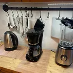 客室はコ-ヒ-/紅茶メ-カ-,座席 とテレビがあり,器具でいっぱいの台所は電子レンジ,電気ポット と冷蔵庫付きです. このル-ムはまた寄木細工の床の他に個別のトイレ とシャワ-を設けたバスル-ムがあります.